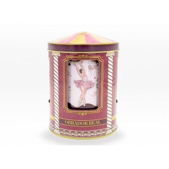 Un homenaje a la belleza y al arte de la danza. Esta delicada lata carrusel recrea una escena de ballet clásico que gira suavemente al ritmo de una melodía envolvente, como si abriera el telón de un teatro encantado. A través de sus ventanas ornamentales, se despliega una secuencia ilustrada de bailarinas en pleno movimiento, enmarcadas por columnas que evocan la magia de una noche de estreno.