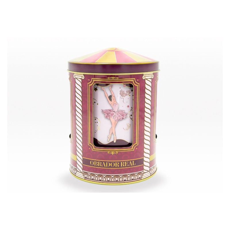 Un homenaje a la belleza y al arte de la danza. Esta delicada lata carrusel recrea una escena de ballet clásico que gira suavemente al ritmo de una melodía envolvente, como si abriera el telón de un teatro encantado. A través de sus ventanas ornamentales, se despliega una secuencia ilustrada de bailarinas en pleno movimiento, enmarcadas por columnas que evocan la magia de una noche de estreno.